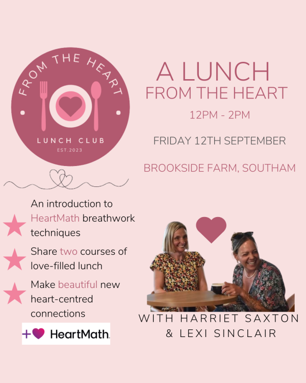 Lexi will serve up two courses of delicious love-filled lunch, and Harriet will introduce you to powerful HeartMath breathwork techniques.