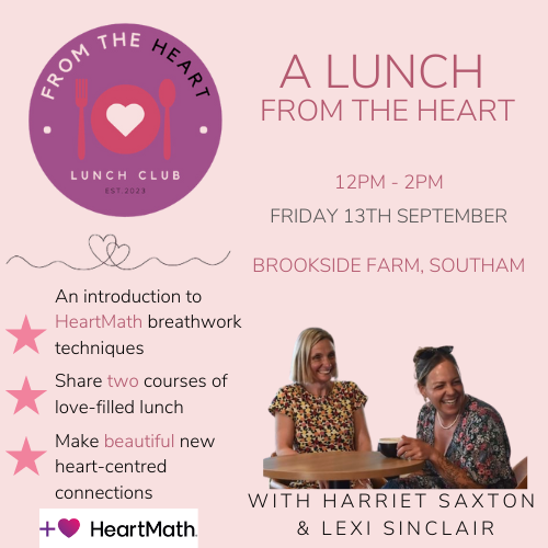 Lexi will serve up two courses of delicious love- filled lunch, and Harriet will introduce you to powerful HeartMath breathwork techniques.