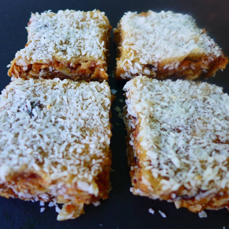 They are definitely a ‘treat’ but they are certainly a healthier option than most shop bought flapjacks, which are often full of refined sugar, and unhealthy fats. These healthier alternatives are nutrient dense. The oats are a great source of complex carbohydrate for long lasting energy. The almonds are rich in monounsaturated fats, which form an important part of the Mediterranean diet and are associated with lower levels of heart disease, cancer, and increased longevity. Almonds are also rich in fibre, protein, calcium, magnesium and Vitamin E. Linseeds & sunflower seeds provide essential anti-inflammatory Omega 3 fats. The sweetness comes from the dates, which although high in natural sugars are a source of calcium, magnesium, fibre, and antioxidants. I have also used brown rice syrup as these is made from complex carbohydrates so helps to slow the release of glucose.