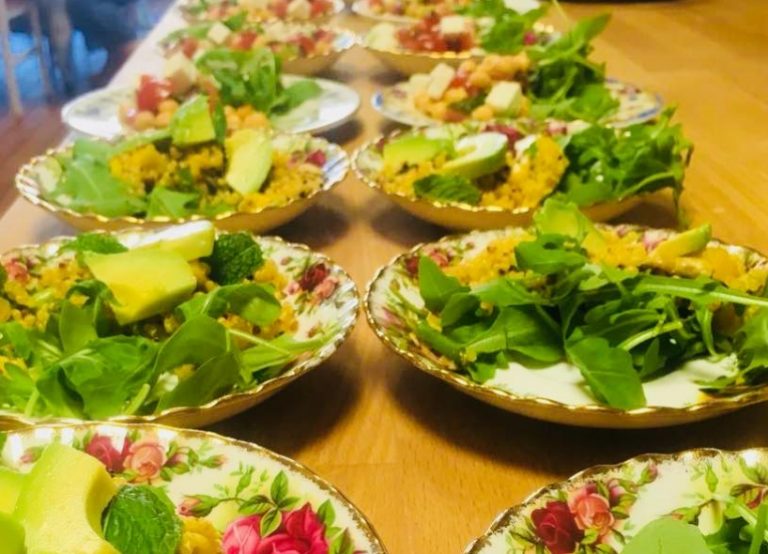We ate & prepared a variety of different salads for our last event, but this salad has proved a popular one. Add in whatever veg you have available, it’s delicious with some seasonal fresh green veg such as peas, courgettes, cucumber, green beans, but feel free to add whatever you fancy!