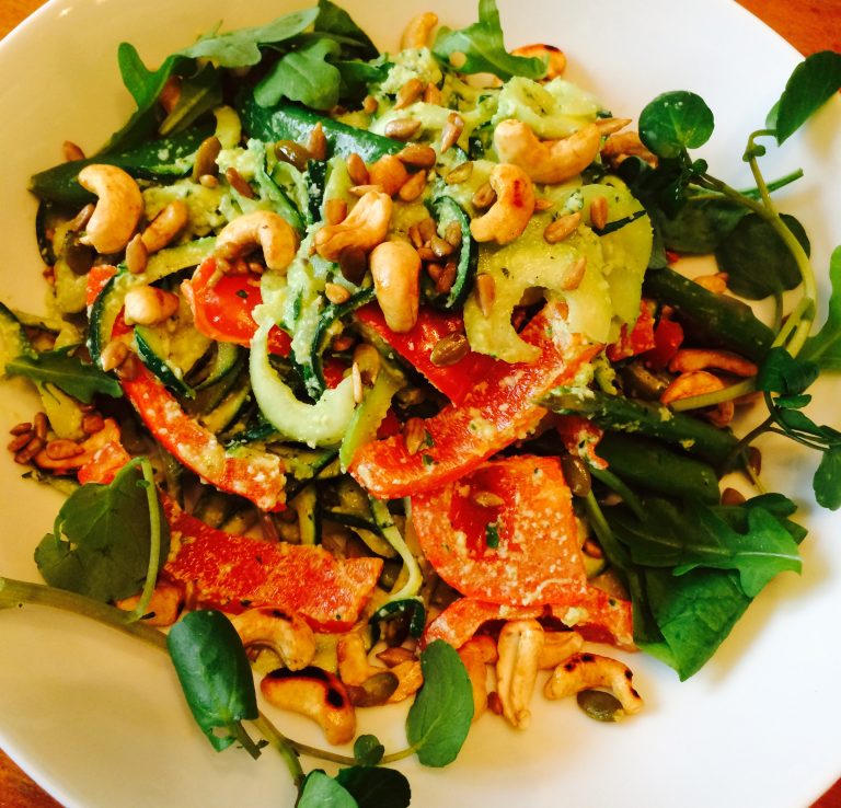 We have been getting courgettes lately in our weekly Canalside share, so I have become partial to the courgetti noodles, as have our kids (marvellous!) So these, coupled with some homemade vegan pesto make it very easy to eat a whole plate of veg! Add some toasted tamari cashews & seeds & you have a great plant based meal, that really is simple, delicious & nutritious!